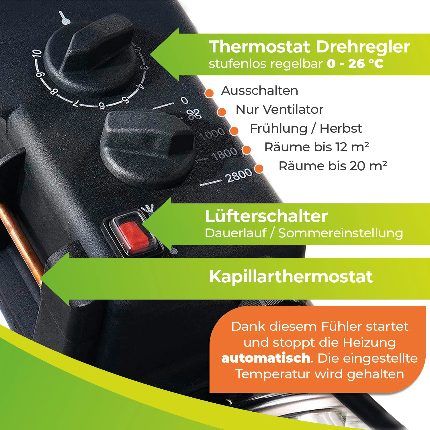 - Stufenlos einstellbares Thermostat: Stellen Sie Ihre Wunsch-Temperatur dank Drehschalter und Ziffernskala ganz einfach ein. Das Thermostat startet und stoppt die Heizung automatisch, wenn die gewünschte Temperatur erreicht ist. Der Temperaturbereich reicht von 0°C bis 26°C.