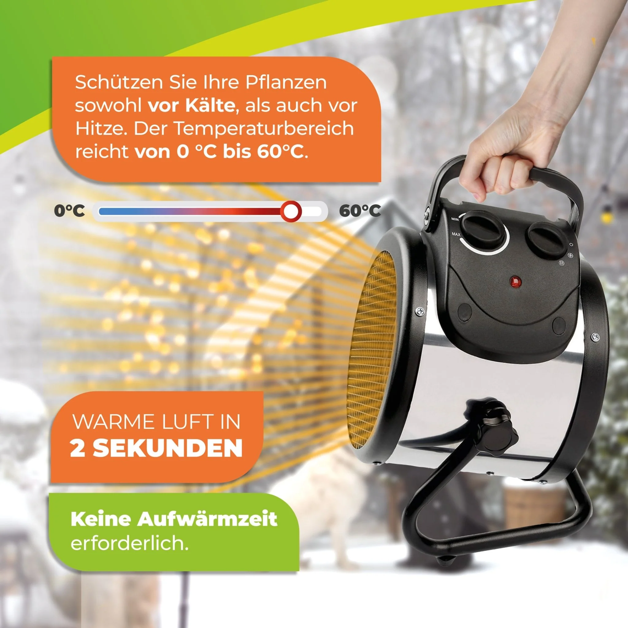 Passt nahezu überall hin: Dank kompakter Maße platzieren Sie die Umluftheizung auch in kleineren Gewächshäusern. Dank einer Kabellänge von 1,90 Metern sind bei der Wahl des Aufstellungsortes sehr flexibel. Dank den rutschfesten Gummifüßen steht die Gewächshausheizung sicher auf dem Boden. Und wenn Sie die Heizung transportieren, haben Sie sie mit dem integrierten, einklappbaren Tragegriff sicher in der Hand. Die Heizung ist nach IPX4 spritzwassergeschützt. So ist sie auch in Feuchträumen sicher und zuverlässig verwendbar. Dank einer robusten Konstruktion hält die Gebläseheizung auch Stöße aus.