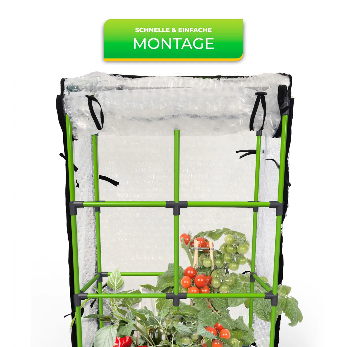 - 3-lagige, UV-beständige Luftpolsterfolie: schützt die Pflanzen an kühleren Tagen und hält Regen ab.