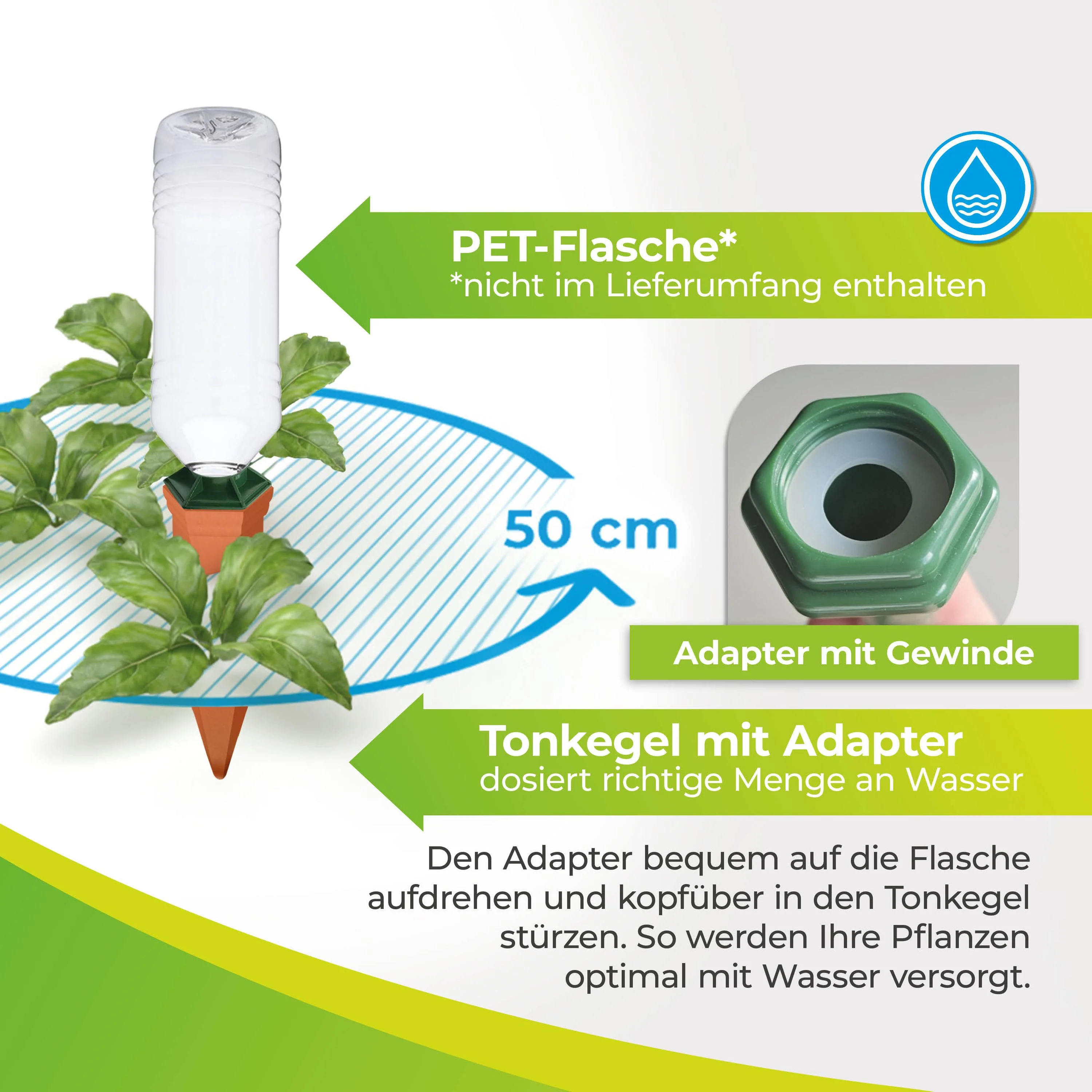 Einfach Gießköpfe auf den Flaschenhals einer mit Wasser gefüllten PET-Flasche setzten, Tonkegel in die zu bewässernde Erde stecken und zurücklehnen. “Hydro Classic” kümmert sich um alles weitere. Dieses Balkonkästen Bewässerungssystem eignet sich für gängige PET-Flaschen bis 1,5 Litern. Der praktische Spezial-Adapter sorgt für garantiert tropffreien Flaschenwechsel.