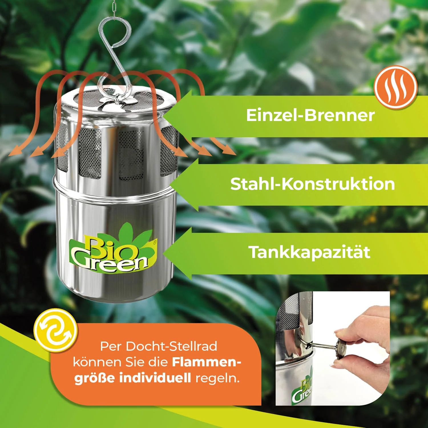 - Einfache Handhabung: Der Tank lässt sich schnell und einfach befüllen. Per Docht-Stellrad regeln Sie die Flammengröße individuell.